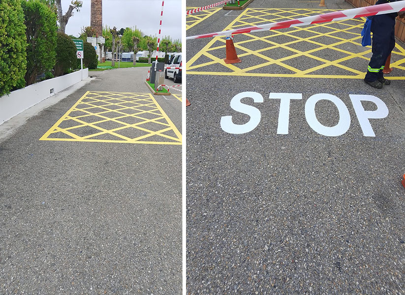 Aplicación de pintura: Aplicamos dos capas de esmalte de poliuretano en color amarillo, creando una zona visible de prohibición de parada para vehículos, resistente a la intemperie y al tránsito constante.